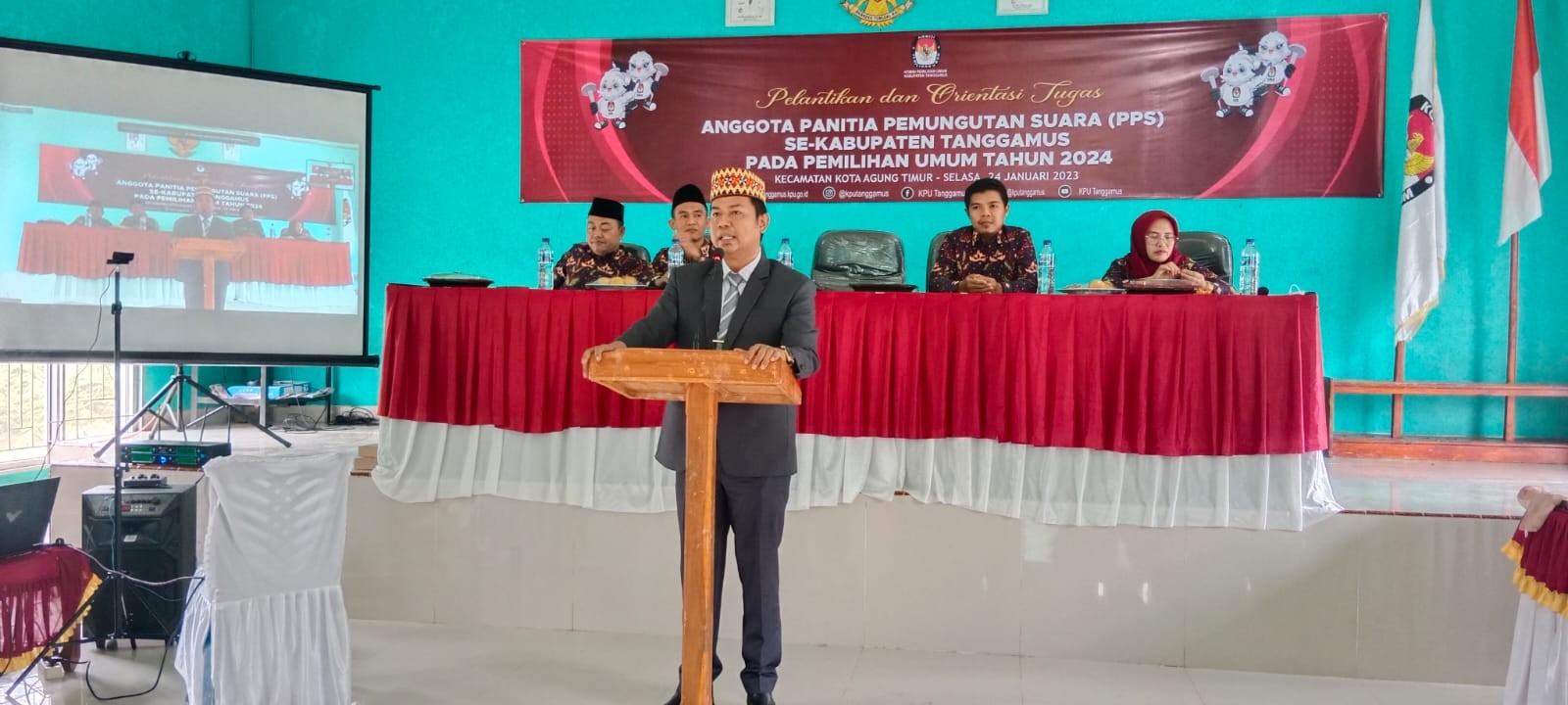 Kota Agung, Selasa 24 Januari 2023 - Komisi Pemilihan Umum (KPU) Kabupaten Tanggamus melantik Panitia Pemungutan Suara (PPS) se-Kabupaten Tanggamus. PPS yang direkrut untuk pemilu tahun 2024 dilantik oleh ketua KPU Angga Lazuardy. Pelantikan dilakukan secara luring di Kecamatan Kota Agung Timur dan di ikuti secara daring oleh 19 kecamatan di Kabupaten Tanggamus.