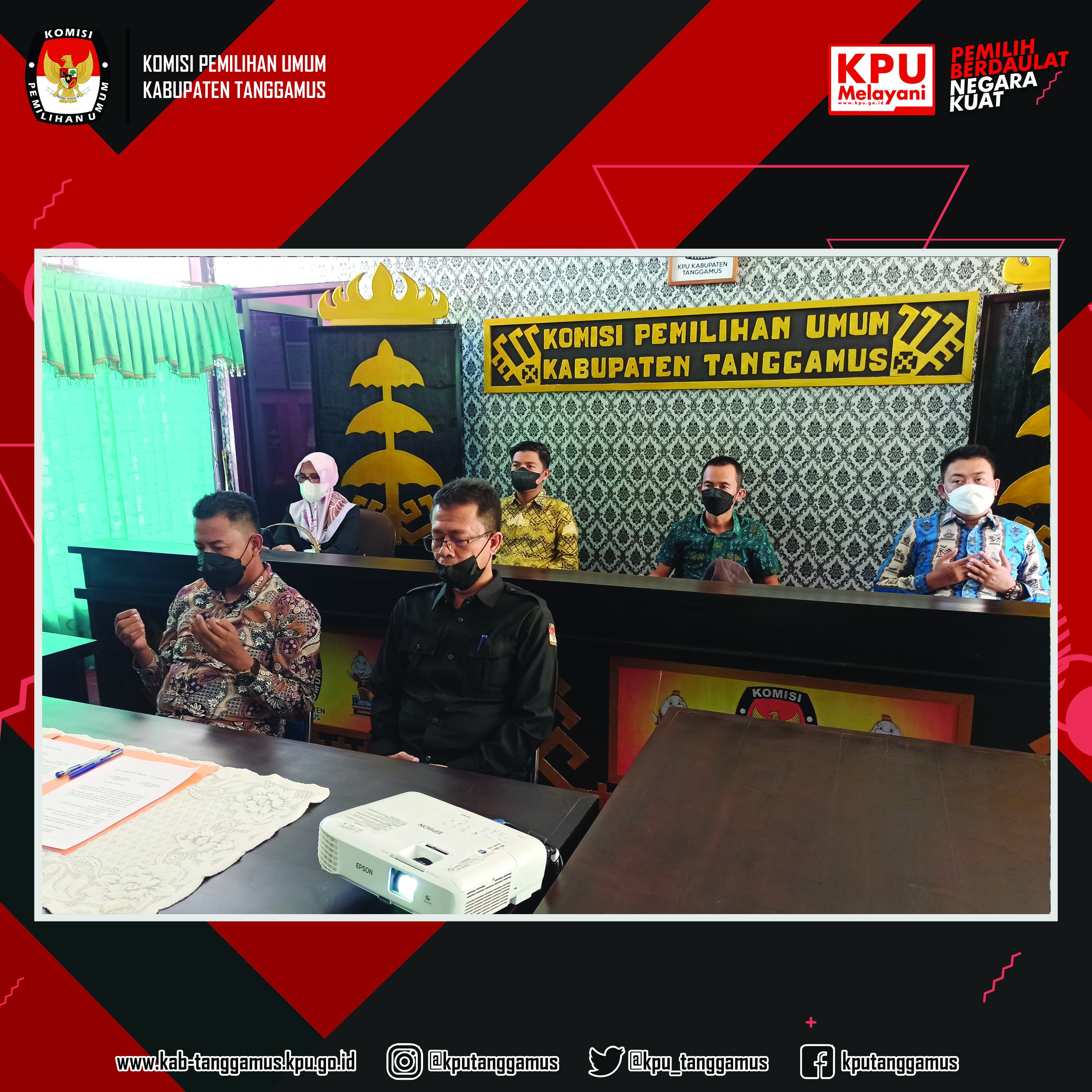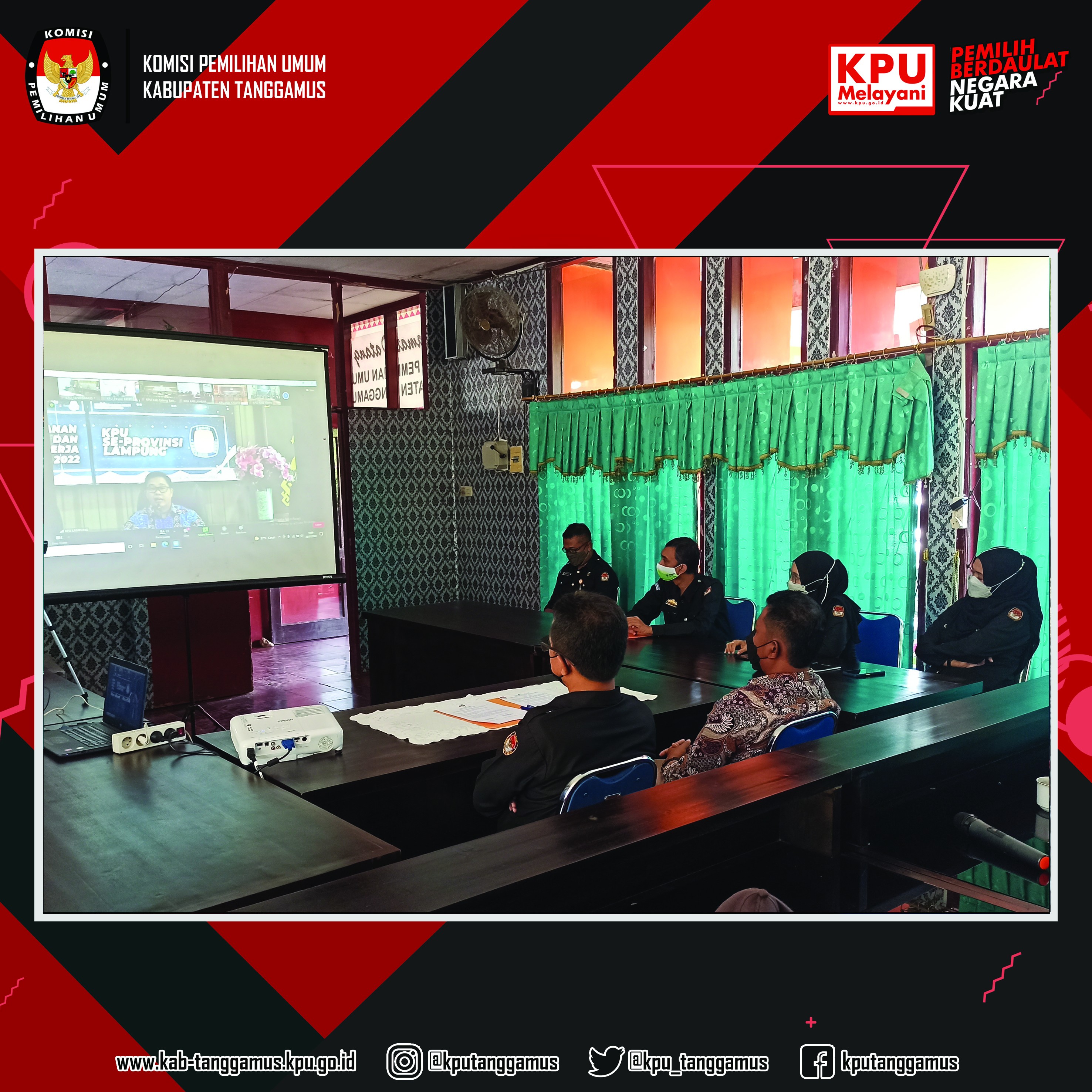 Kota Agung, 26 Januari 2022 - KPU Tanggamus mengikuti Penandatanganan Pakta Integritas dan Perjanjian Kinerja Tahun 2022 KPU se-Provinsi Lampung melalui zoom meeting. Acara tersebut dibuka oleh Ketua KPU Propinsi Lampung Erwan Bustami, SH., MH., dalam sambutannya Ketua KPU Propinsi Lampung menghimbau untuk para jajaran KPU se-Provinsi Lampung untuk menjaga nama baik lembaga.