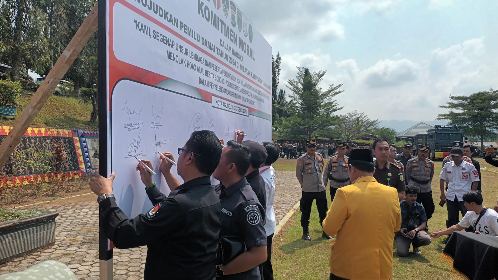 Kapolres Siswara Hadi Chandra berharap kepada seluruh stacholder untuk menandatangani Komitmen Moral dalam menjaga sistem keamanan kota selama tahapan Pemilu 2024. Dan seluruh stacholder yang hadir diminta untuk menandatangani Komitmen Moral dalam menjaga sistem keamanan kota selama tahapan Pemilu 2024.