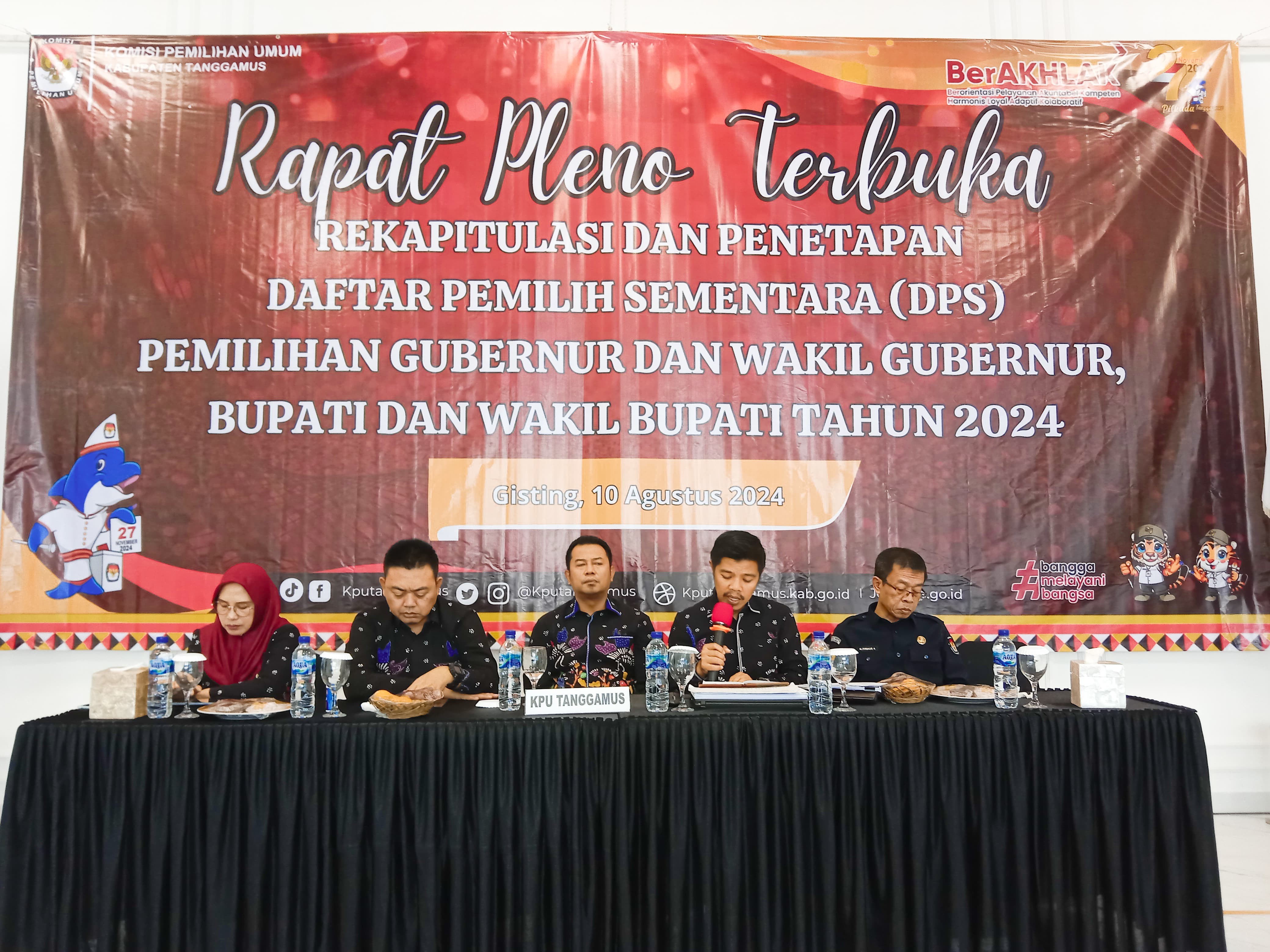 Temanpemilih, KPU Tanggamus melaksanakan tahapan rekapitulasi daftar pemilih hasil pemutakhiran dan penetapan daftar pemilih sementara (DPS) untuk Pilkada 2024, di Aula Hotel Royal Gisting, 10 Agustus 2024. Rapat Pleno dibuka oleh ketua KPU Tanggamus Angga Lazuardy, dalam sambutannya disampaikan bahwa pemutakhiran data pemilih mengacu pada regulasi PKPU 007 2024 dan Juknis 799 2024. Sehingga proses pemutakhiran ini tidak terlepas dari regulasi yang ada. Habibi selaku kadiv rendatin memimpin rapat dengan mengawali pemaparan tentang tahapan pemutakhiran data pemilih pilkada 2024, kemudian dilanjutkan dengan pembacaan hasil rekapitulasi DPHP oleh PPK. Setelah PPK membacakan, kemudian Habibi memberi kesempatan peserta Pleno menanggapi hasil rekapitulasi untuk mendapat masukan-masukan. Adapun setelah pleno selesai, KPU Tanggamus menandatangani Berita Acara Penetapan DPS Pilkada 2024 dan selanjutnya mengeluarkan Surat Keputusan KPU Tanggamus Nomor: 1859 Tahun 2024 tentang penetapan rekapitulasi daftar pemilih sementara kabupaten Tanggamus, adapun jumlah pemilih total 453.950 dengan rincian pemilih Laki-laki 234.203, pemilih perempuan 219.747 yang tersebar di 20 kecamatan 302 Desa/kelurahan. Adapun untuk TPS berjumlah 981 TPS yang terdiri dari 979 TPS regular dan 2 TPS Lokasi khusus di lapas Kelas 2B Kota Agung serta rutan kelas 2B Kota agung. Diakhir pleno KPU Tanggamus menyerahkan salinan Keputusan DPS kepada para peserta pleno. Perlu di ketahui rapat pleno rekapitulasi dan penetapan daftar pemilih sementara ini di hadiri oleh PPK 20 Kecamatan, Bupati diwakili oleh Kesbangpol, Kodim 0424/Tanggamus, Polres Tanggamus, Kejaksaan Negeri Tanggamus, Disdukcapil Tanggamus. Hadir pula dalam kesempatan ini, Penanggung jawab TPS Lokasi Khusus dari Lapas kelas 2B Kota Agung dan Rutan Kelas 2B Kota Agung. Di akhir acara Ketua KPU Tanggamus menutup Rapat Pleno dan berpesan kepada seluruh elemen masyarakat untuk ikut berpartisipasi aktif memeberikan masukan dan tanggapan terhadap hasil pleno DPS, dapat menghubungi PPS, PPK dan juga KPU Tanggamus atau mengunjungi portal cekdptonline.kpu.go.id #Pilkada2024 #KPUTanggamus @KPUProvinsiLampung @KPURI