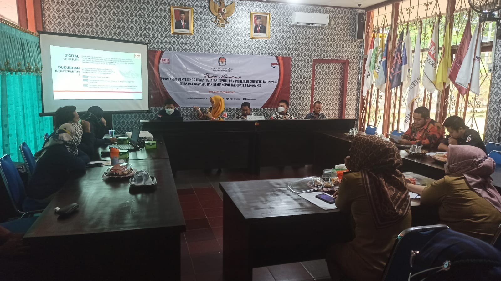 Selasa, 21 Desember 2021 - KPU Tanggamus hari pukul 9.30 s.d 12.00 WIB mengadakan Rapat koordinasi Persiapan Tahapan Penyelenggaraan Pemilu dan Pemilihan Serentak 2024, bersama Bawaslu yang dihadiri Ali Usman, ST dan Kesbangpol Kabupaten Tanggamus yang dihadiri ibu Risnah selaku Kabagpol juga Kasi Ibu Lily.