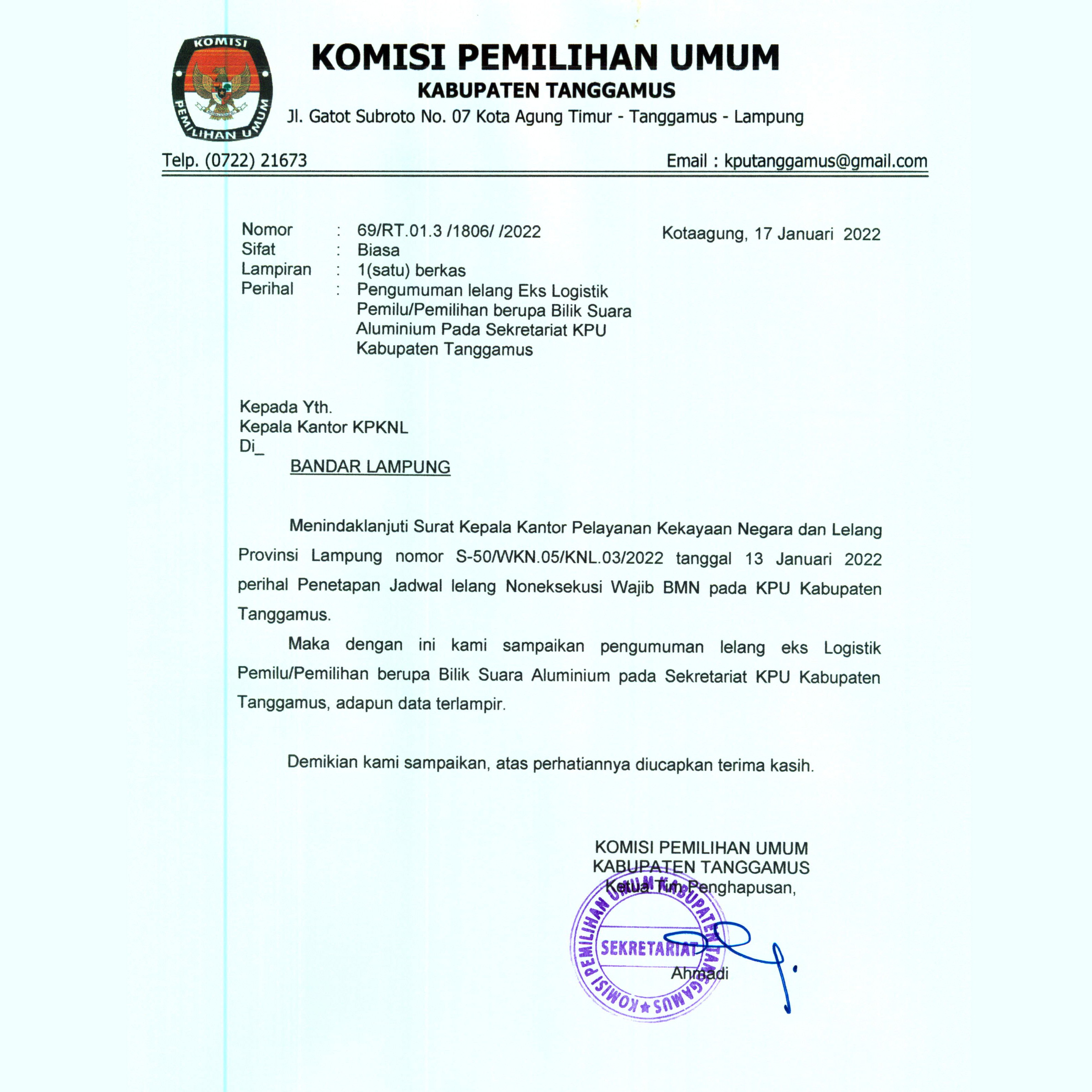 KPU Kabupaten Tanggamus menindaklanjuti Surat Kepala KPKNL Provinsi Lampung nomor S-50/WKN.05/KNL.03/2022 tanggal 13 Januari 2022 perihal Penetapan Jadwal Lelang Noneksekusi Wajib BMN pada KPU Kabupaten Tanggamus. Maka dengan ini kami sampaikan pengumuman lelang eks Logistik Pemilu/Pemilihan berupa bilik suara aluminium pada Sekretariat KPU Kabupaten Tanggamus.